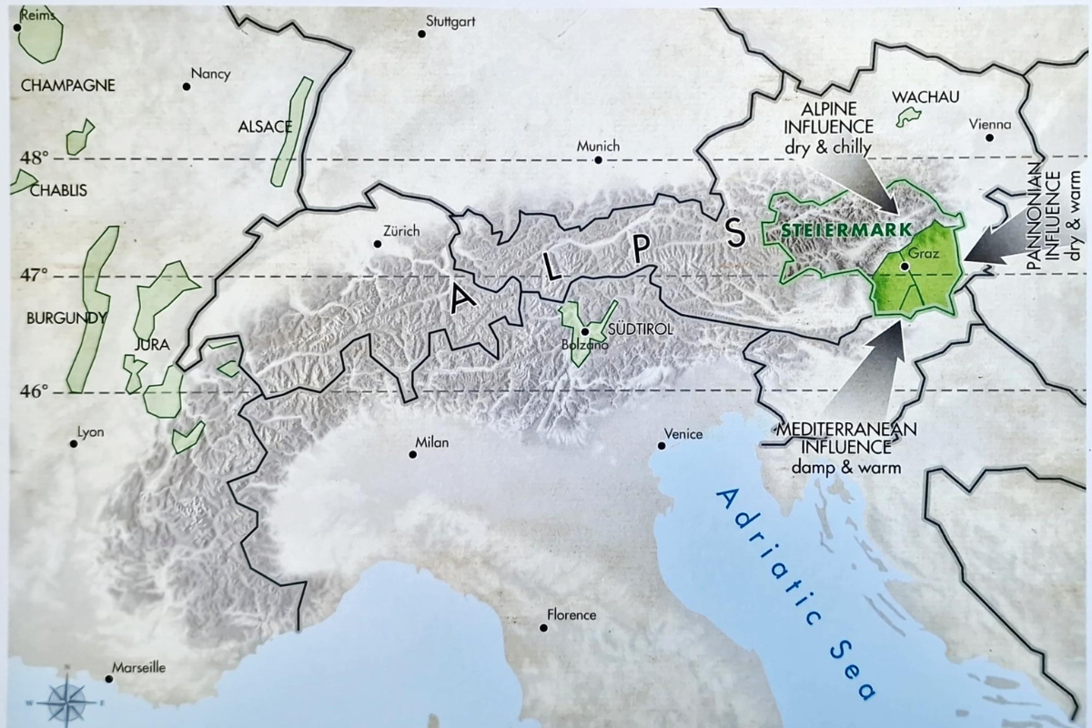 Pannonian Warmth: To the east, the Pannonian Plain (from Hungary) brings warm air currents into Steiermark, especially in the southern and eastern parts of the region. This warmth helps to extend the growing season, allowing grapes to ripen fully while maintaining a balance of acidity and sugar levels. The combination of cool alpine air and the warm Pannonian influences creates a large diurnal temperature variation that is essential for developing the aromatic complexity and vibrant acidity that Styrian wines are known for.